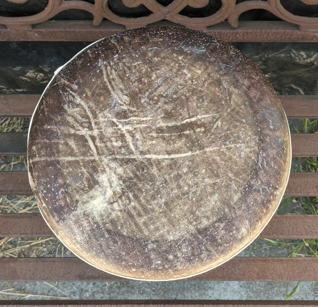 Leslie has a vintage Syrian darbuka that is showing its age. The drum head is in tatters, and the finish of the metal shell has becomy dingy. Corrosion has begun to set it.