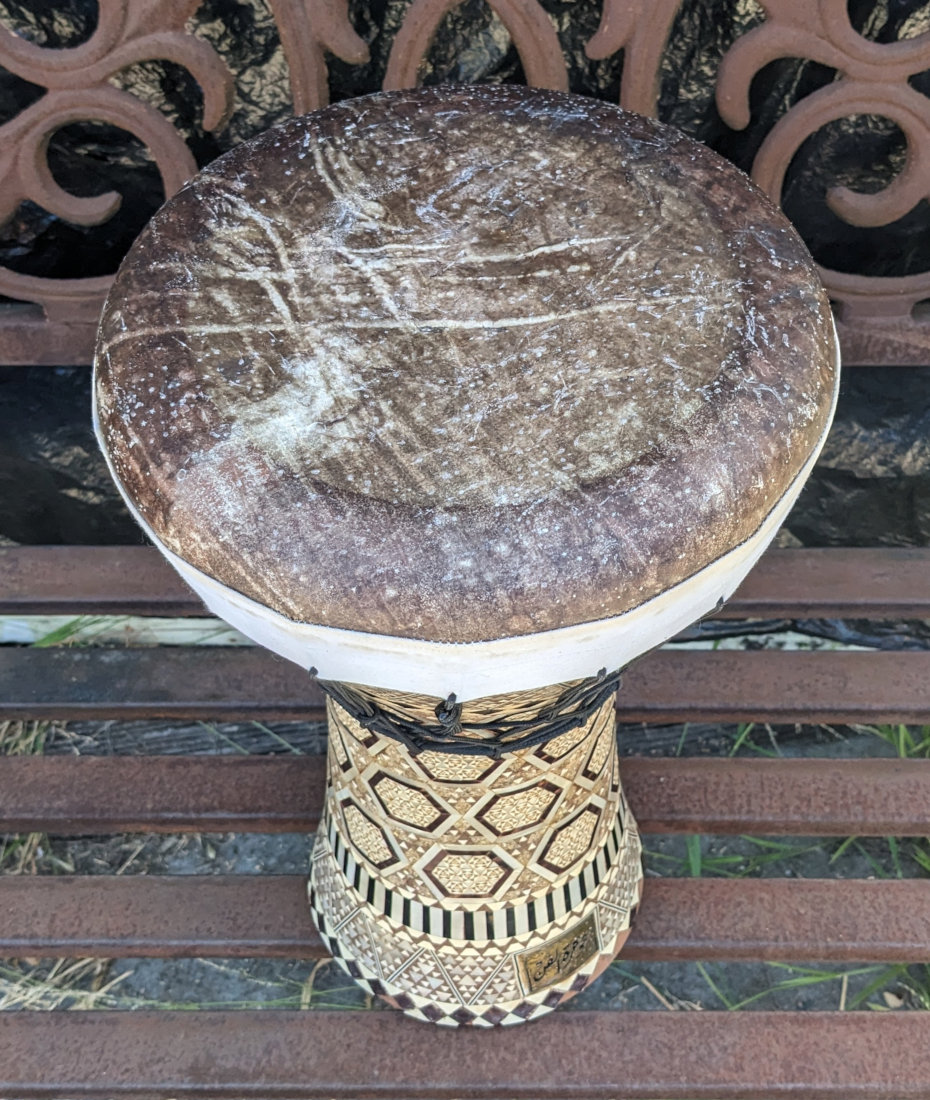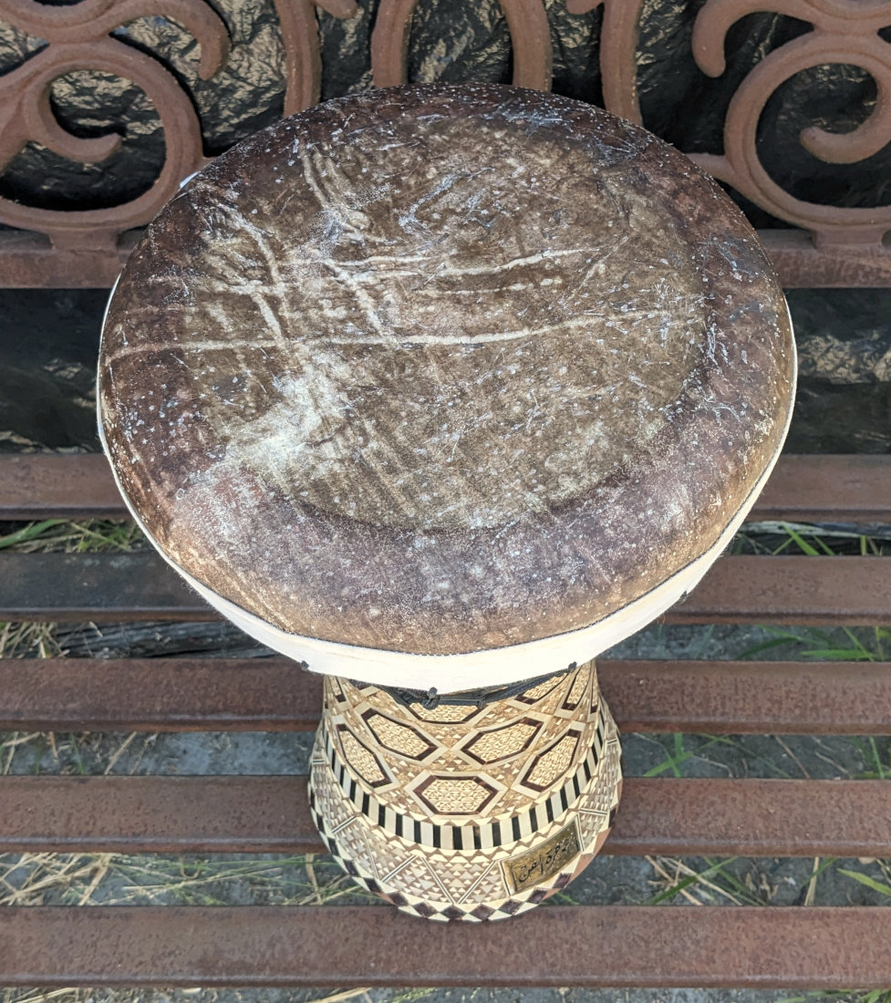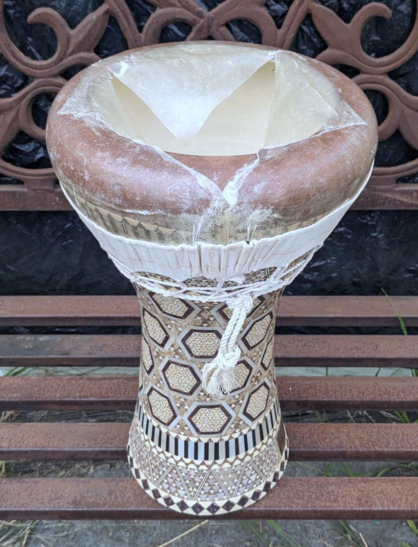 We have another doumbek with a head that needs to be replaced. Unlike the previous doumbek, this drum is more traditional. The body is made of wooden staves, covered with an intricate pattern of decorative mother of pearl. The head is goatskin.