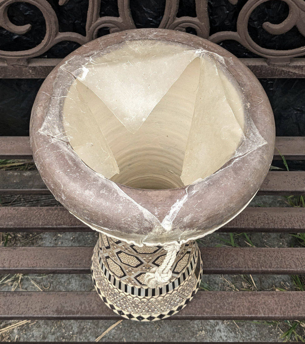 The goat skin on this doumbek is glued in place. The rope you see is used to stretch the skin into place and hold it taut as the glue dries. We are going to take a different approach to mounting the fresh goat skin drum head. We are going to do something very special.