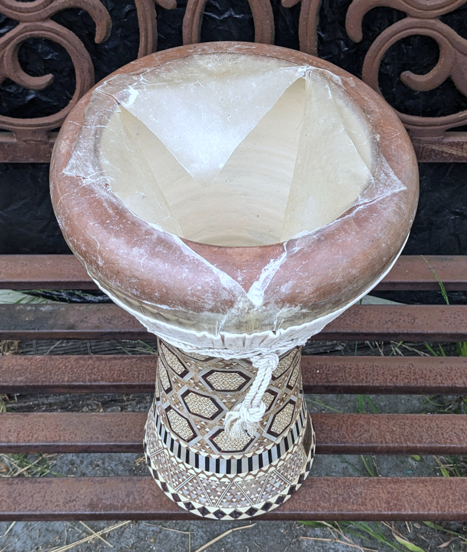 Fred, of Fred Taylor Music, is a drummer that has expanded his toolbox to include hand drums. This lovely doumbek has had a hole punched in the drum head which renders the drum toneless.