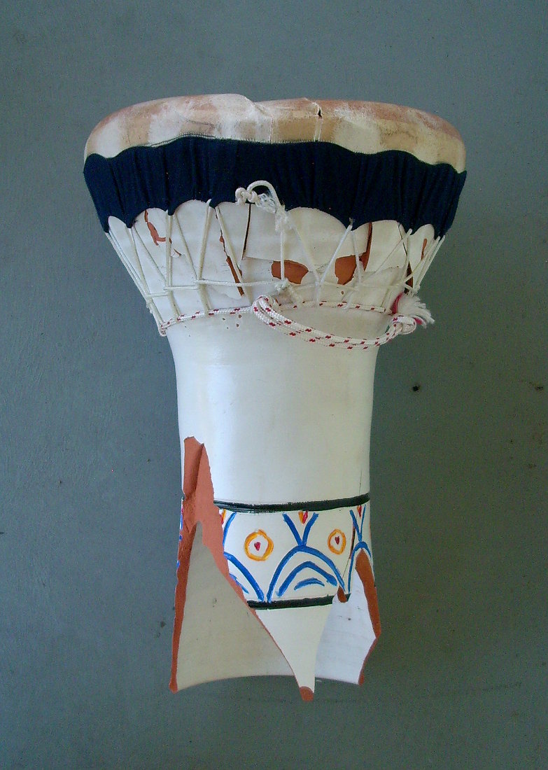 Here's a mini darbuka that originally sported a mylar drum head. Mini because it's got a 6" drum head.