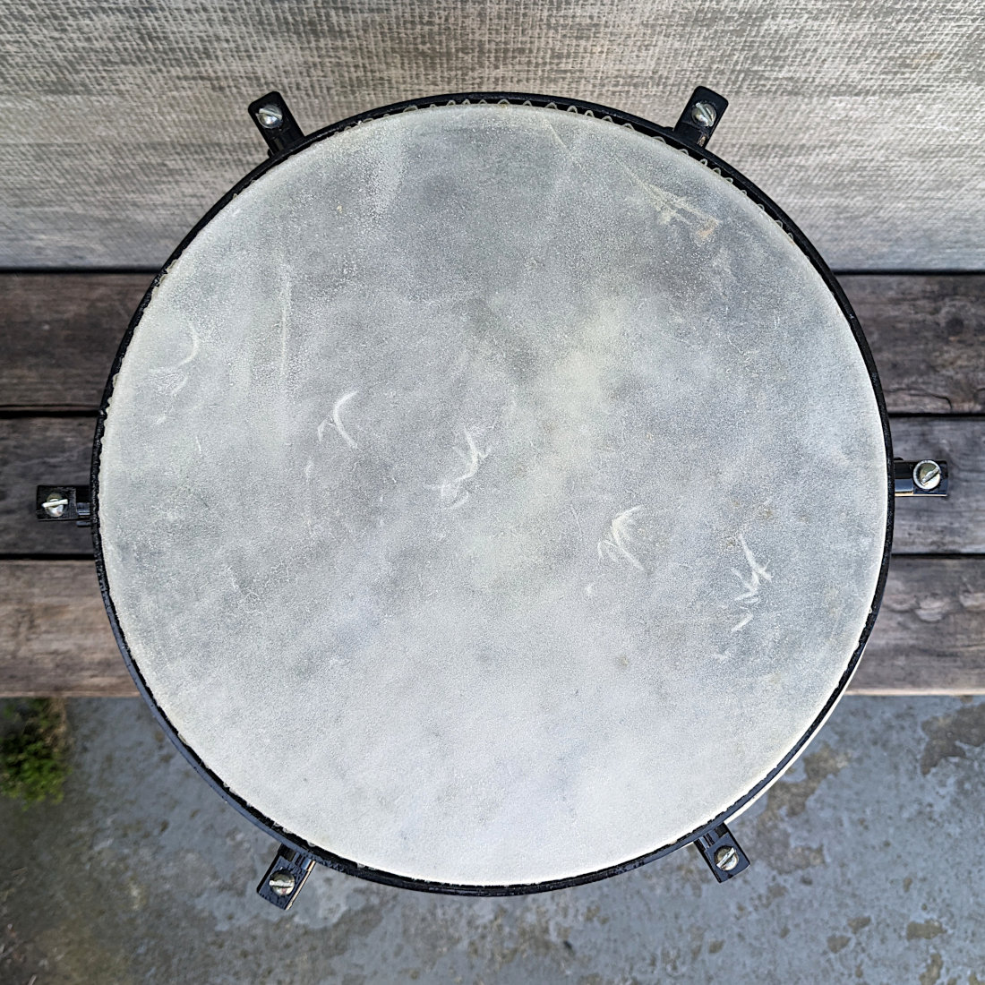 Fred, of Fred Taylor Music, is a drummer that has expanded his toolbox to include hand drums. This lovely doumbek has had a hole punched in the drum head which renders the drum toneless.
