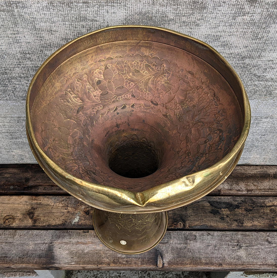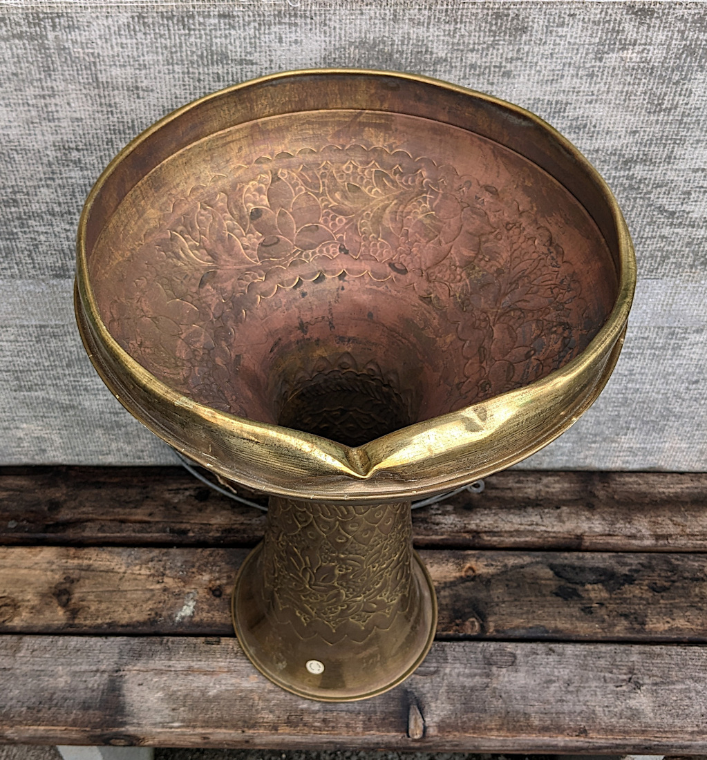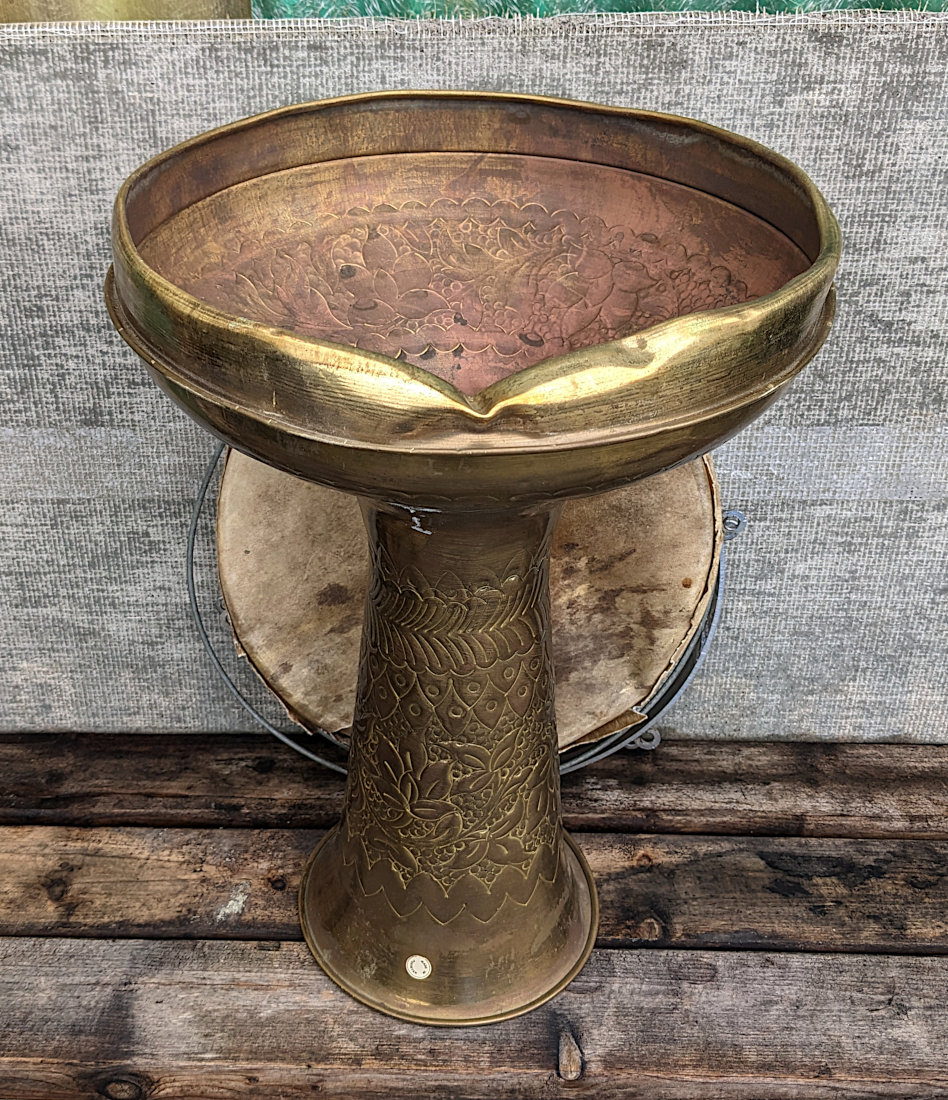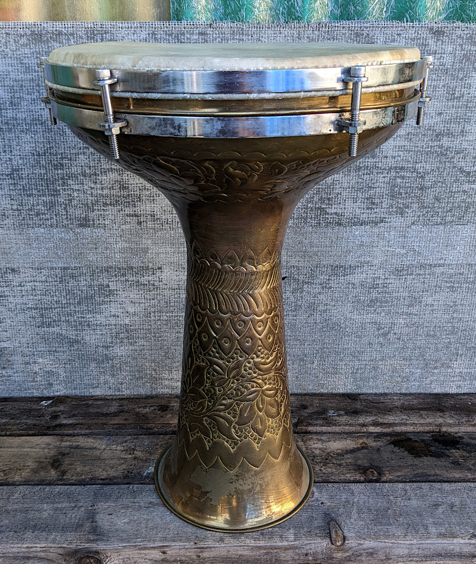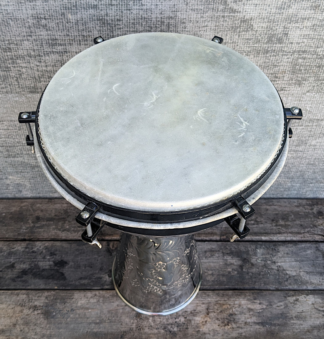 Leslie has a vintage Syrian darbuka that is showing its age. The drum head is in tatters, and the finish of the metal shell has becomy dingy. Corrosion has begun to set it.