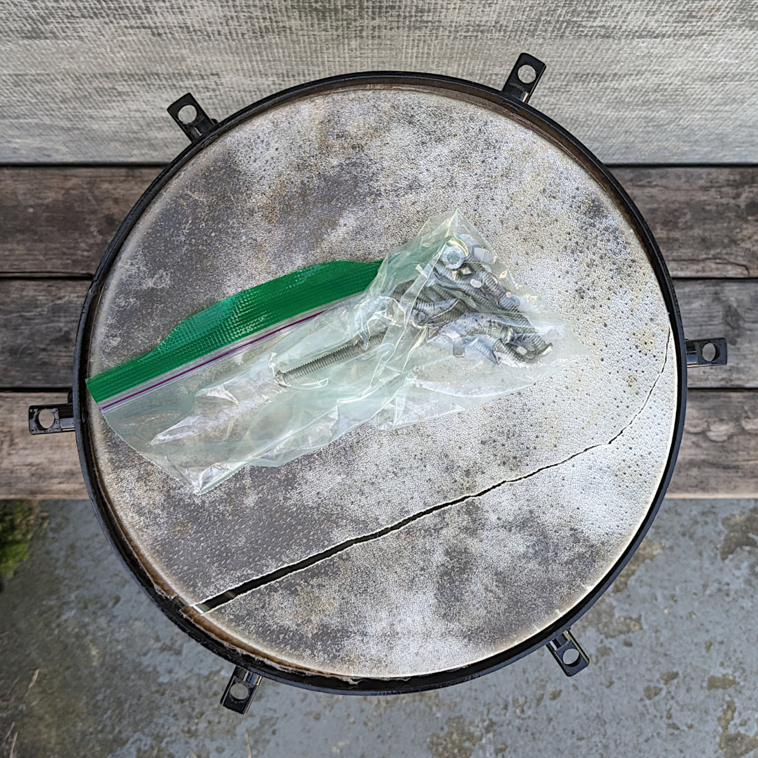 We begin by removing the torn skin and carefully setting aside all those pieces from the top that were now loose. Remember all the pieces at the bottom of the drum case? Here you can se that we've put those back together agian.