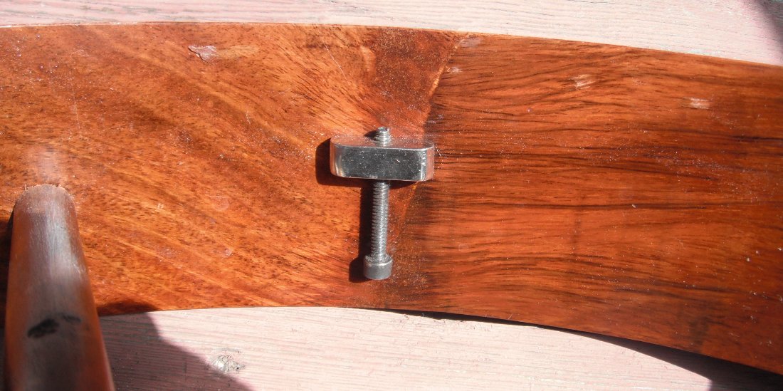 If you look closely at the closeup of the tuning bolt, you'll notice some damage to the frame above the bolt. This damage was caused by the tacks that held the goatskin drum head in place. They were just too long. Here's a better look. The tacks didn't only damage the frame. Notice that they pierce the frame precisely where the tuning ring is located. This means they interfered with the tuning mechanism.